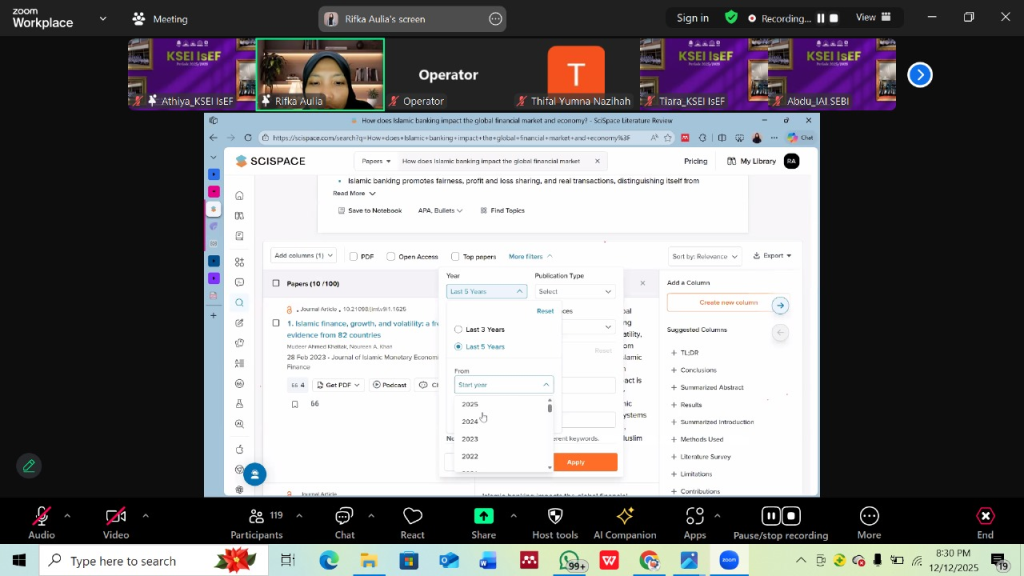 Pada hari kedua, Jum’at, 12 Desember 2025, seminar dilanjutkan bersama Rifka Aulia dengan tema “Mastering Writing Tools & Management.” Sesi ini membahas tantangan publikasi ilmiah di era informasi serta pemanfaatan berbagai tools riset, mulai dari eksplorasi literatur, reading assistant, pengolahan data, hingga penulisan dan penyelesaian naskah. Pemateri menegaskan pentingnya integritas dalam penelitian dengan pesan, “Peneliti boleh salah, tetapi tidak boleh berbohong.”